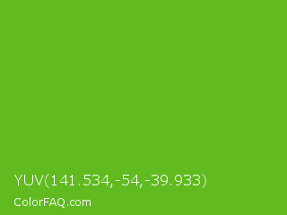 YUV 141.534,-54,-39.933 Color is a normal green color and the nearest color is Green RYB #66b032. Hex code #60ba20 and RGB value is rgb(96,186,32). In RGB color space, this color is composed of 38% red, 73% green, 13% blue, In CMYK color space, this color is composed of 48% cyan, 0% magenta, 83% yellow , 27% black , In HSL color space, this color has a hue angle of 95° , 71% saturation and 43% lightness.