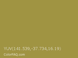 YUV 141.539,-37.734,16.19 Color is a normal yellow color and the nearest color is Sycamore #908d39. Hex code #a09341 and RGB value is rgb(160,147,65). In RGB color space, this color is composed of 63% red, 58% green, 25% blue, In CMYK color space, this color is composed of 0% cyan, 8% magenta, 59% yellow , 37% black , In HSL color space, this color has a hue angle of 52° , 42% saturation and 44% lightness.