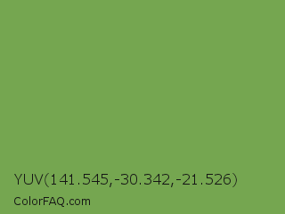 YUV 141.545,-30.342,-21.526 Color is a normal green color and the nearest color is Asparagus Green #7ba05b. Hex code #75a650 and RGB value is rgb(117,166,80). In RGB color space, this color is composed of 46% red, 65% green, 31% blue, In CMYK color space, this color is composed of 30% cyan, 0% magenta, 52% yellow , 35% black , In HSL color space, this color has a hue angle of 94° , 35% saturation and 48% lightness.