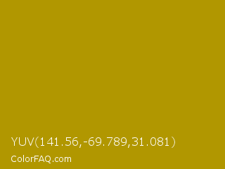 YUV 141.56,-69.789,31.081 Color is a normal yellow color and the nearest color is Buddha Gold #c1a004. Hex code #b19700 and RGB value is rgb(177,151,-0). In RGB color space, this color is composed of 69% red, 59% green, 0% blue, In CMYK color space, this color is composed of 0% cyan, 15% magenta, 100% yellow , 31% black , In HSL color space, this color has a hue angle of 51° , 100% saturation and 35% lightness.