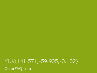 YUV 141.571,-59.935,-3.132 Color is a normal lime color and the nearest color is Citron #9fa91f. Hex code #8aa714 and RGB value is rgb(138,167,20). In RGB color space, this color is composed of 54% red, 65% green, 8% blue, In CMYK color space, this color is composed of 17% cyan, 0% magenta, 88% yellow , 35% black , In HSL color space, this color has a hue angle of 72° , 79% saturation and 37% lightness.