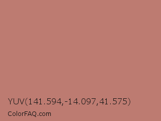 YUV 141.594,-14.097,41.575 Color is a normal red color and the nearest color is Contessa #c6726b. Hex code #bd7b71 and RGB value is rgb(189,123,113). In RGB color space, this color is composed of 74% red, 48% green, 44% blue, In CMYK color space, this color is composed of 0% cyan, 35% magenta, 40% yellow , 26% black , In HSL color space, this color has a hue angle of 8° , 37% saturation and 59% lightness.