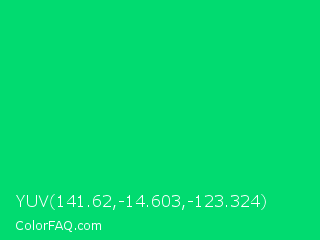 YUV 141.62,-14.603,-123.324 Color is a normal green color and the nearest color is Malachite #0bda51. Hex code #01db70 and RGB value is rgb(1,219,112). In RGB color space, this color is composed of 0% red, 86% green, 44% blue, In CMYK color space, this color is composed of 100% cyan, 0% magenta, 49% yellow , 14% black , In HSL color space, this color has a hue angle of 151° , 99% saturation and 43% lightness.