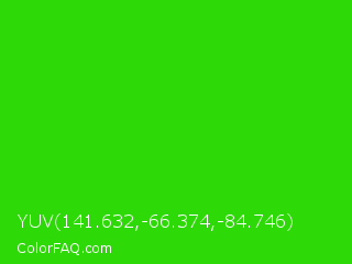 YUV 141.632,-66.374,-84.746 Color is a normal green color and the nearest color is Harlequin Green #46cb18. Hex code #2dd907 and RGB value is rgb(45,217,7). In RGB color space, this color is composed of 18% red, 85% green, 3% blue, In CMYK color space, this color is composed of 79% cyan, 0% magenta, 97% yellow , 15% black , In HSL color space, this color has a hue angle of 109° , 94% saturation and 44% lightness.