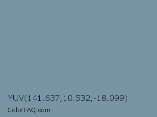 YUV 141.637,10.532,-18.099 Color is a normal blue color and the nearest color is Shadow Blue #778ba5. Hex code #7994a3 and RGB value is rgb(121,148,163). In RGB color space, this color is composed of 47% red, 58% green, 64% blue, In CMYK color space, this color is composed of 26% cyan, 9% magenta, 0% yellow , 36% black , In HSL color space, this color has a hue angle of 201° , 19% saturation and 56% lightness.