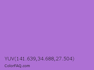 YUV 141.639,34.688,27.504 Color is a light purple color and the nearest color is Rich Lavender #a76bcf. Hex code #ad70d4 and RGB value is rgb(173,112,212). In RGB color space, this color is composed of 68% red, 44% green, 83% blue, In CMYK color space, this color is composed of 18% cyan, 47% magenta, 0% yellow , 17% black , In HSL color space, this color has a hue angle of 277° , 54% saturation and 64% lightness.