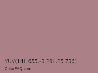 YUV 141.655,-3.281,25.736 Color is a normal red color and the nearest color is Pharlap #a3807b. Hex code #ab8087 and RGB value is rgb(171,128,135). In RGB color space, this color is composed of 67% red, 50% green, 53% blue, In CMYK color space, this color is composed of 0% cyan, 25% magenta, 21% yellow , 33% black , In HSL color space, this color has a hue angle of 350° , 20% saturation and 59% lightness.