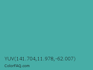 YUV 141.704,11.978,-62.007 Color is a normal cyan color and the nearest color is Verdigris #43b3ae. Hex code #47ada6 and RGB value is rgb(71,173,166). In RGB color space, this color is composed of 28% red, 68% green, 65% blue, In CMYK color space, this color is composed of 59% cyan, 0% magenta, 4% yellow , 32% black , In HSL color space, this color has a hue angle of 176° , 42% saturation and 48% lightness.