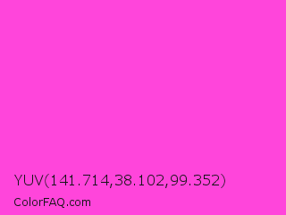 YUV 141.714,38.102,99.352 Color is a light magenta color and the nearest color is Purple Pizzazz #fe4eda. Hex code #ff45db and RGB value is rgb(255,69,219). In RGB color space, this color is composed of 100% red, 27% green, 86% blue, In CMYK color space, this color is composed of 0% cyan, 73% magenta, 14% yellow , 0% black , In HSL color space, this color has a hue angle of 312° , 100% saturation and 64% lightness.