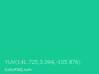 YUV 141.725,3.094,-105.876 Color is a normal green color and the nearest color is Caribbean Green #00cc99. Hex code #15ca94 and RGB value is rgb(21,202,148). In RGB color space, this color is composed of 8% red, 79% green, 58% blue, In CMYK color space, this color is composed of 90% cyan, 0% magenta, 27% yellow , 21% black , In HSL color space, this color has a hue angle of 162° , 81% saturation and 44% lightness.