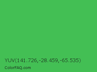 YUV 141.726,-28.459,-65.535 Color is a normal green color and the nearest color is Chateau Green #40a860. Hex code #43bf54 and RGB value is rgb(67,191,84). In RGB color space, this color is composed of 26% red, 75% green, 33% blue, In CMYK color space, this color is composed of 65% cyan, 0% magenta, 56% yellow , 25% black , In HSL color space, this color has a hue angle of 128° , 49% saturation and 51% lightness.