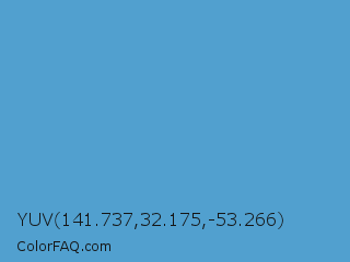 YUV 141.737,32.175,-53.266 Color is a normal blue color and the nearest color is Carolina Blue #56a0d3. Hex code #51a0cf and RGB value is rgb(81,160,207). In RGB color space, this color is composed of 32% red, 63% green, 81% blue, In CMYK color space, this color is composed of 61% cyan, 23% magenta, 0% yellow , 19% black , In HSL color space, this color has a hue angle of 202° , 57% saturation and 56% lightness.
