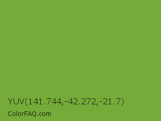 YUV 141.744,-42.272,-21.7 Color is a normal green color and the nearest color is Green RYB #66b032. Hex code #75ab38 and RGB value is rgb(117,171,56). In RGB color space, this color is composed of 46% red, 67% green, 22% blue, In CMYK color space, this color is composed of 32% cyan, 0% magenta, 67% yellow , 33% black , In HSL color space, this color has a hue angle of 88° , 51% saturation and 45% lightness.