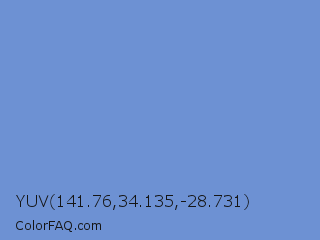 YUV 141.76,34.135,-28.731 Color is a light blue color and the nearest color is Blue Gray #6699cc. Hex code #6d91d3 and RGB value is rgb(109,145,211). In RGB color space, this color is composed of 43% red, 57% green, 83% blue, In CMYK color space, this color is composed of 48% cyan, 31% magenta, 0% yellow , 17% black , In HSL color space, this color has a hue angle of 219° , 54% saturation and 63% lightness.