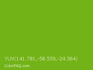 YUV 141.781,-58.559,-24.364 Color is a normal green color and the nearest color is Lima #76bd17. Hex code #72b317 and RGB value is rgb(114,179,23). In RGB color space, this color is composed of 45% red, 70% green, 9% blue, In CMYK color space, this color is composed of 36% cyan, 0% magenta, 87% yellow , 30% black , In HSL color space, this color has a hue angle of 85° , 77% saturation and 40% lightness.