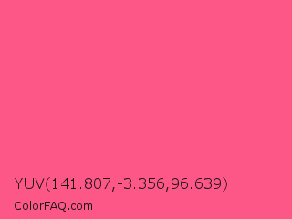 YUV 141.807,-3.356,96.639 Color is a light rose color and the nearest color is Strawberry #fc5a8d. Hex code #fc5787 and RGB value is rgb(252,87,135). In RGB color space, this color is composed of 99% red, 34% green, 53% blue, In CMYK color space, this color is composed of 0% cyan, 65% magenta, 46% yellow , 1% black , In HSL color space, this color has a hue angle of 343° , 96% saturation and 66% lightness.
