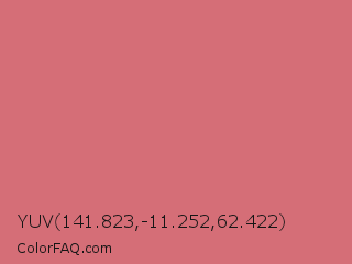YUV 141.823,-11.252,62.422 Color is a light red color and the nearest color is Candy Pink #e4717a. Hex code #d56e77 and RGB value is rgb(213,110,119). In RGB color space, this color is composed of 84% red, 43% green, 47% blue, In CMYK color space, this color is composed of 0% cyan, 48% magenta, 44% yellow , 16% black , In HSL color space, this color has a hue angle of 355° , 55% saturation and 63% lightness.