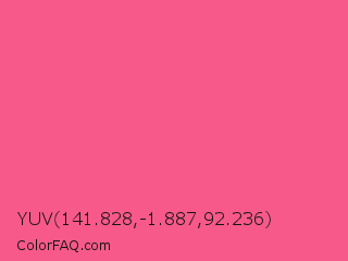 YUV 141.828,-1.887,92.236 Color is a light rose color and the nearest color is Strawberry #fc5a8d. Hex code #f7598a and RGB value is rgb(247,89,138). In RGB color space, this color is composed of 97% red, 35% green, 54% blue, In CMYK color space, this color is composed of 0% cyan, 64% magenta, 44% yellow , 3% black , In HSL color space, this color has a hue angle of 341° , 91% saturation and 66% lightness.