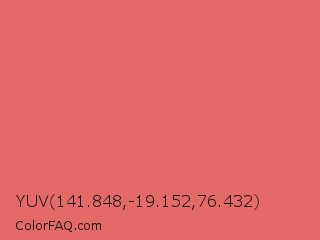 YUV 141.848,-19.152,76.432 Color is a light red color and the nearest color is Sunglo #e16865. Hex code #e56967 and RGB value is rgb(229,105,103). In RGB color space, this color is composed of 90% red, 41% green, 40% blue, In CMYK color space, this color is composed of 0% cyan, 54% magenta, 55% yellow , 10% black , In HSL color space, this color has a hue angle of 1° , 71% saturation and 65% lightness.