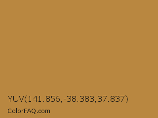 YUV 141.856,-38.383,37.837 Color is a normal orange color and the nearest color is Driftwood #af8751. Hex code #b98740 and RGB value is rgb(185,135,64). In RGB color space, this color is composed of 73% red, 53% green, 25% blue, In CMYK color space, this color is composed of 0% cyan, 27% magenta, 65% yellow , 27% black , In HSL color space, this color has a hue angle of 35° , 49% saturation and 49% lightness.