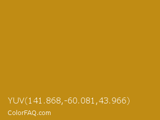 YUV 141.868,-60.081,43.966 Color is a normal orange color and the nearest color is Pizza #c99415. Hex code #c08c14 and RGB value is rgb(192,140,20). In RGB color space, this color is composed of 75% red, 55% green, 8% blue, In CMYK color space, this color is composed of 0% cyan, 27% magenta, 90% yellow , 25% black , In HSL color space, this color has a hue angle of 42° , 81% saturation and 42% lightness.