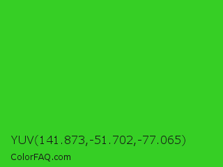 YUV 141.873,-51.702,-77.065 Color is a normal green color and the nearest color is Lime Green #32cd32. Hex code #36cf25 and RGB value is rgb(54,207,37). In RGB color space, this color is composed of 21% red, 81% green, 15% blue, In CMYK color space, this color is composed of 74% cyan, 0% magenta, 82% yellow , 19% black , In HSL color space, this color has a hue angle of 114° , 70% saturation and 48% lightness.