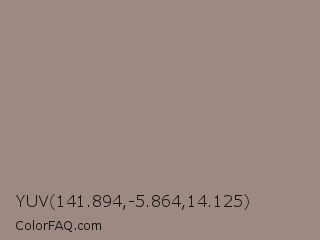 YUV 141.894,-5.864,14.125 Color is a normal red color and the nearest color is Cinereous #98817b. Hex code #9e8882 and RGB value is rgb(158,136,130). In RGB color space, this color is composed of 62% red, 53% green, 51% blue, In CMYK color space, this color is composed of 0% cyan, 14% magenta, 18% yellow , 38% black , In HSL color space, this color has a hue angle of 13° , 13% saturation and 56% lightness.
