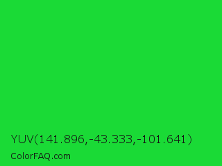 YUV 141.896,-43.333,-101.641 Color is a normal green color and the nearest color is Lime Green #32cd32. Hex code #1ada36 and RGB value is rgb(26,218,54). In RGB color space, this color is composed of 10% red, 85% green, 21% blue, In CMYK color space, this color is composed of 88% cyan, 0% magenta, 75% yellow , 15% black , In HSL color space, this color has a hue angle of 129° , 79% saturation and 48% lightness.