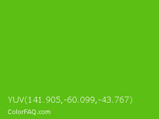 YUV 141.905,-60.099,-43.767 Color is a normal green color and the nearest color is Kelly Green #4cbb17. Hex code #5cbf14 and RGB value is rgb(92,191,20). In RGB color space, this color is composed of 36% red, 75% green, 8% blue, In CMYK color space, this color is composed of 52% cyan, 0% magenta, 90% yellow , 25% black , In HSL color space, this color has a hue angle of 95° , 81% saturation and 41% lightness.