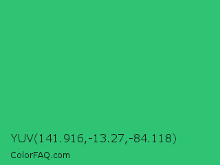 YUV 141.916,-13.27,-84.118 Color is a normal green color and the nearest color is UFO Green #3cd070. Hex code #2ec473 and RGB value is rgb(46,196,115). In RGB color space, this color is composed of 18% red, 77% green, 45% blue, In CMYK color space, this color is composed of 77% cyan, 0% magenta, 41% yellow , 23% black , In HSL color space, this color has a hue angle of 148° , 62% saturation and 47% lightness.