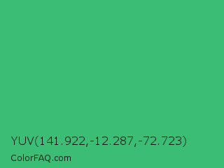 YUV 141.922,-12.287,-72.723 Color is a normal green color and the nearest color is Medium Sea Green #3cb371. Hex code #3bbd75 and RGB value is rgb(59,189,117). In RGB color space, this color is composed of 23% red, 74% green, 46% blue, In CMYK color space, this color is composed of 69% cyan, 0% magenta, 38% yellow , 26% black , In HSL color space, this color has a hue angle of 147° , 52% saturation and 49% lightness.