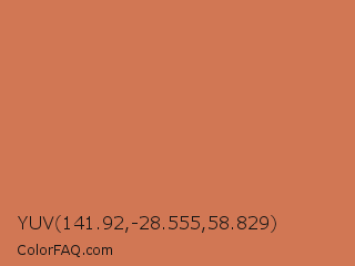YUV 141.92,-28.555,58.829 Color is a normal orange color and the nearest color is Copper Red #cb6d51. Hex code #d17754 and RGB value is rgb(209,119,84). In RGB color space, this color is composed of 82% red, 47% green, 33% blue, In CMYK color space, this color is composed of 0% cyan, 43% magenta, 60% yellow , 18% black , In HSL color space, this color has a hue angle of 17° , 58% saturation and 57% lightness.