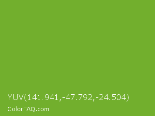 YUV 141.941,-47.792,-24.504 Color is a normal green color and the nearest color is Green RYB #66b032. Hex code #72af2d and RGB value is rgb(114,175,45). In RGB color space, this color is composed of 45% red, 69% green, 18% blue, In CMYK color space, this color is composed of 35% cyan, 0% magenta, 74% yellow , 31% black , In HSL color space, this color has a hue angle of 88° , 59% saturation and 43% lightness.