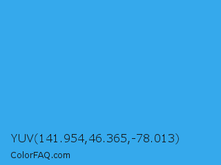YUV 141.954,46.365,-78.013 Color is a normal blue color and the nearest color is Picton Blue #45b1e8. Hex code #35a9ec and RGB value is rgb(53,169,236). In RGB color space, this color is composed of 21% red, 66% green, 93% blue, In CMYK color space, this color is composed of 78% cyan, 28% magenta, 0% yellow , 7% black , In HSL color space, this color has a hue angle of 202° , 83% saturation and 57% lightness.