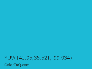 YUV 141.95,35.521,-99.934 Color is a normal cyan color and the nearest color is Battery Charged Blue #1dacd6. Hex code #1cbad6 and RGB value is rgb(28,186,214). In RGB color space, this color is composed of 11% red, 73% green, 84% blue, In CMYK color space, this color is composed of 87% cyan, 13% magenta, 0% yellow , 16% black , In HSL color space, this color has a hue angle of 189° , 77% saturation and 47% lightness.