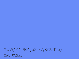 YUV 141.961,52.77,-32.415 Color is a light blue color and the nearest color is Cornflower Blue #6495ed. Hex code #698cf9 and RGB value is rgb(105,140,249). In RGB color space, this color is composed of 41% red, 55% green, 98% blue, In CMYK color space, this color is composed of 58% cyan, 44% magenta, 0% yellow , 2% black , In HSL color space, this color has a hue angle of 225° , 92% saturation and 69% lightness.