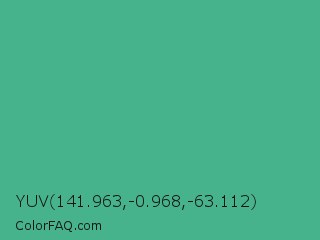 YUV 141.963,-0.968,-63.112 Color is a normal green color and the nearest color is Mint #3eb489. Hex code #46b38c and RGB value is rgb(70,179,140). In RGB color space, this color is composed of 27% red, 70% green, 55% blue, In CMYK color space, this color is composed of 61% cyan, 0% magenta, 22% yellow , 30% black , In HSL color space, this color has a hue angle of 159° , 44% saturation and 49% lightness.
