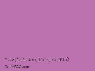 YUV 141.966,15.3,39.495 Color is a normal magenta color and the nearest color is Pearly Purple #b768a2. Hex code #bb71ad and RGB value is rgb(187,113,173). In RGB color space, this color is composed of 73% red, 44% green, 68% blue, In CMYK color space, this color is composed of 0% cyan, 40% magenta, 7% yellow , 27% black , In HSL color space, this color has a hue angle of 311° , 35% saturation and 59% lightness.