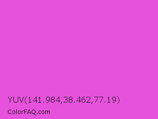 YUV 141.984,38.462,77.19 Color is a light magenta color and the nearest color is Purple Pizzazz #fe4eda. Hex code #e652dc and RGB value is rgb(230,82,220). In RGB color space, this color is composed of 90% red, 32% green, 86% blue, In CMYK color space, this color is composed of 0% cyan, 64% magenta, 4% yellow , 10% black , In HSL color space, this color has a hue angle of 304° , 75% saturation and 61% lightness.