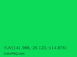 YUV 141.988,-26.123,-114.876 Color is a normal green color and the nearest color is Malachite #0bda51. Hex code #0bdb59 and RGB value is rgb(11,219,89). In RGB color space, this color is composed of 4% red, 86% green, 35% blue, In CMYK color space, this color is composed of 95% cyan, 0% magenta, 59% yellow , 14% black , In HSL color space, this color has a hue angle of 143° , 90% saturation and 45% lightness.