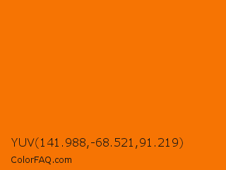 YUV 141.988,-68.521,91.219 Color is a normal orange color and the nearest color is Chilean Fire #f77703. Hex code #f67403 and RGB value is rgb(246,116,3). In RGB color space, this color is composed of 96% red, 45% green, 1% blue, In CMYK color space, this color is composed of 0% cyan, 53% magenta, 99% yellow , 4% black , In HSL color space, this color has a hue angle of 28° , 98% saturation and 49% lightness.