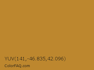 YUV 141,-46.835,42.096 Color is a normal orange color and the nearest color is University Of California Gold #b78727. Hex code #bd872e and RGB value is rgb(189,135,46). In RGB color space, this color is composed of 74% red, 53% green, 18% blue, In CMYK color space, this color is composed of 0% cyan, 29% magenta, 76% yellow , 26% black , In HSL color space, this color has a hue angle of 37° , 61% saturation and 46% lightness.