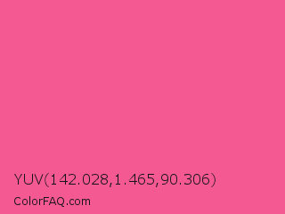 YUV 142.028,1.465,90.306 Color is a light rose color and the nearest color is Violet Red #f75394. Hex code #f55991 and RGB value is rgb(245,89,145). In RGB color space, this color is composed of 96% red, 35% green, 57% blue, In CMYK color space, this color is composed of 0% cyan, 64% magenta, 41% yellow , 4% black , In HSL color space, this color has a hue angle of 338° , 89% saturation and 65% lightness.