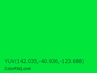 YUV 142.035,-40.936,-123.688 Color is a normal green color and the nearest color is Malachite #0bda51. Hex code #01e63b and RGB value is rgb(1,230,59). In RGB color space, this color is composed of 0% red, 90% green, 23% blue, In CMYK color space, this color is composed of 100% cyan, 0% magenta, 74% yellow , 10% black , In HSL color space, this color has a hue angle of 135° , 99% saturation and 45% lightness.