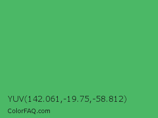 YUV 142.061,-19.75,-58.812 Color is a normal green color and the nearest color is Medium Sea Green #3cb371. Hex code #4bb866 and RGB value is rgb(75,184,102). In RGB color space, this color is composed of 29% red, 72% green, 40% blue, In CMYK color space, this color is composed of 59% cyan, 0% magenta, 45% yellow , 28% black , In HSL color space, this color has a hue angle of 135° , 43% saturation and 51% lightness.