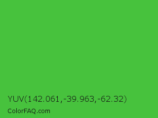 YUV 142.061,-39.963,-62.32 Color is a normal green color and the nearest color is Lime Green #32cd32. Hex code #47c23d and RGB value is rgb(71,194,61). In RGB color space, this color is composed of 28% red, 76% green, 24% blue, In CMYK color space, this color is composed of 63% cyan, 0% magenta, 69% yellow , 24% black , In HSL color space, this color has a hue angle of 115° , 52% saturation and 50% lightness.