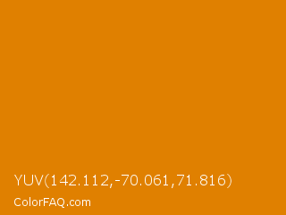 YUV 142.112,-70.061,71.816 Color is a normal orange color and the nearest color is Fulvous #e48400. Hex code #e08000 and RGB value is rgb(224,128,-0). In RGB color space, this color is composed of 88% red, 50% green, 0% blue, In CMYK color space, this color is composed of 0% cyan, 43% magenta, 100% yellow , 12% black , In HSL color space, this color has a hue angle of 34° , 100% saturation and 44% lightness.