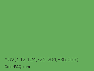 YUV 142.124,-25.204,-36.066 Color is a normal green color and the nearest color is Fern #63b76c. Hex code #65ad5b and RGB value is rgb(101,173,91). In RGB color space, this color is composed of 40% red, 68% green, 36% blue, In CMYK color space, this color is composed of 42% cyan, 0% magenta, 47% yellow , 32% black , In HSL color space, this color has a hue angle of 113° , 33% saturation and 52% lightness.