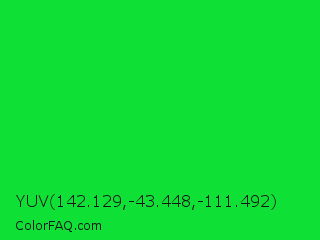 YUV 142.129,-43.448,-111.492 Color is a normal green color and the nearest color is Vivid Malachite #00cc33. Hex code #0fe036 and RGB value is rgb(15,224,54). In RGB color space, this color is composed of 6% red, 88% green, 21% blue, In CMYK color space, this color is composed of 93% cyan, 0% magenta, 76% yellow , 12% black , In HSL color space, this color has a hue angle of 131° , 87% saturation and 47% lightness.