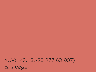 YUV 142.13,-20.277,63.907 Color is a light red color and the nearest color is Japonica #d87c63. Hex code #d77165 and RGB value is rgb(215,113,101). In RGB color space, this color is composed of 84% red, 44% green, 40% blue, In CMYK color space, this color is composed of 0% cyan, 47% magenta, 53% yellow , 16% black , In HSL color space, this color has a hue angle of 6° , 59% saturation and 62% lightness.